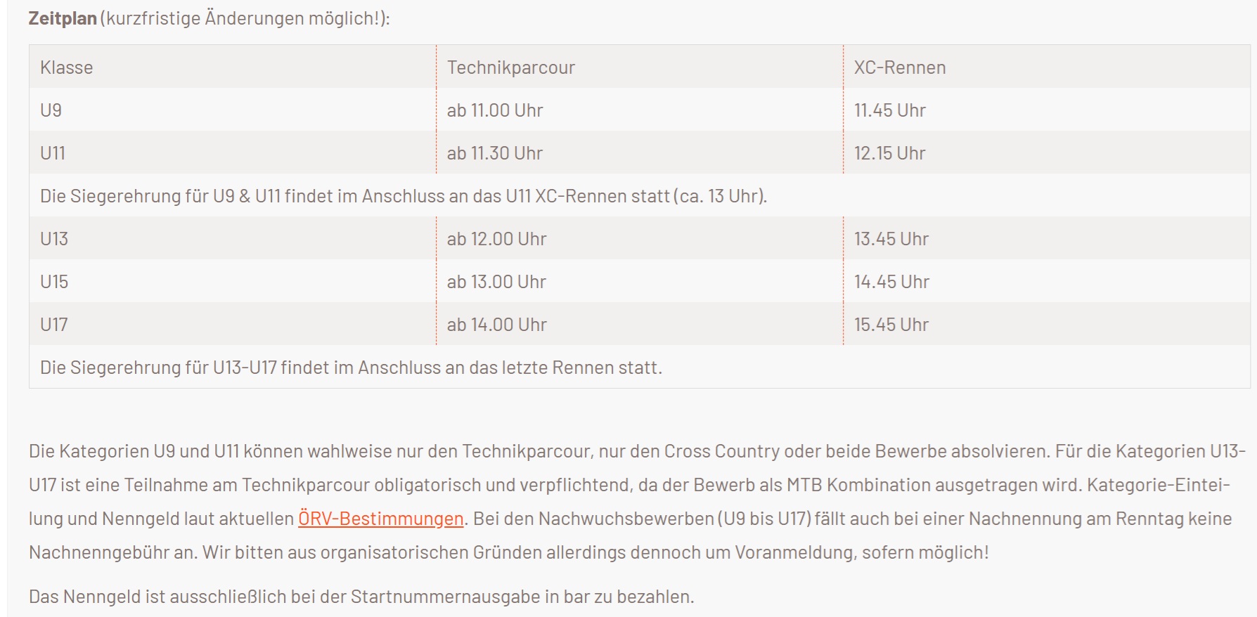 | Nenngeld: | U9 - U11: WAHLWEISE TP und/oder XCO - dementsprechend beträgt das Nenngeld für U9 bis U11 entweder € 8,- (nur TP oder nur XCO) oder € 16,- (TP & XCO). U13 - U17: € 22,- XCO laut ÖRV - in bar bei Abholung, KEINE Vorabüberweisung |